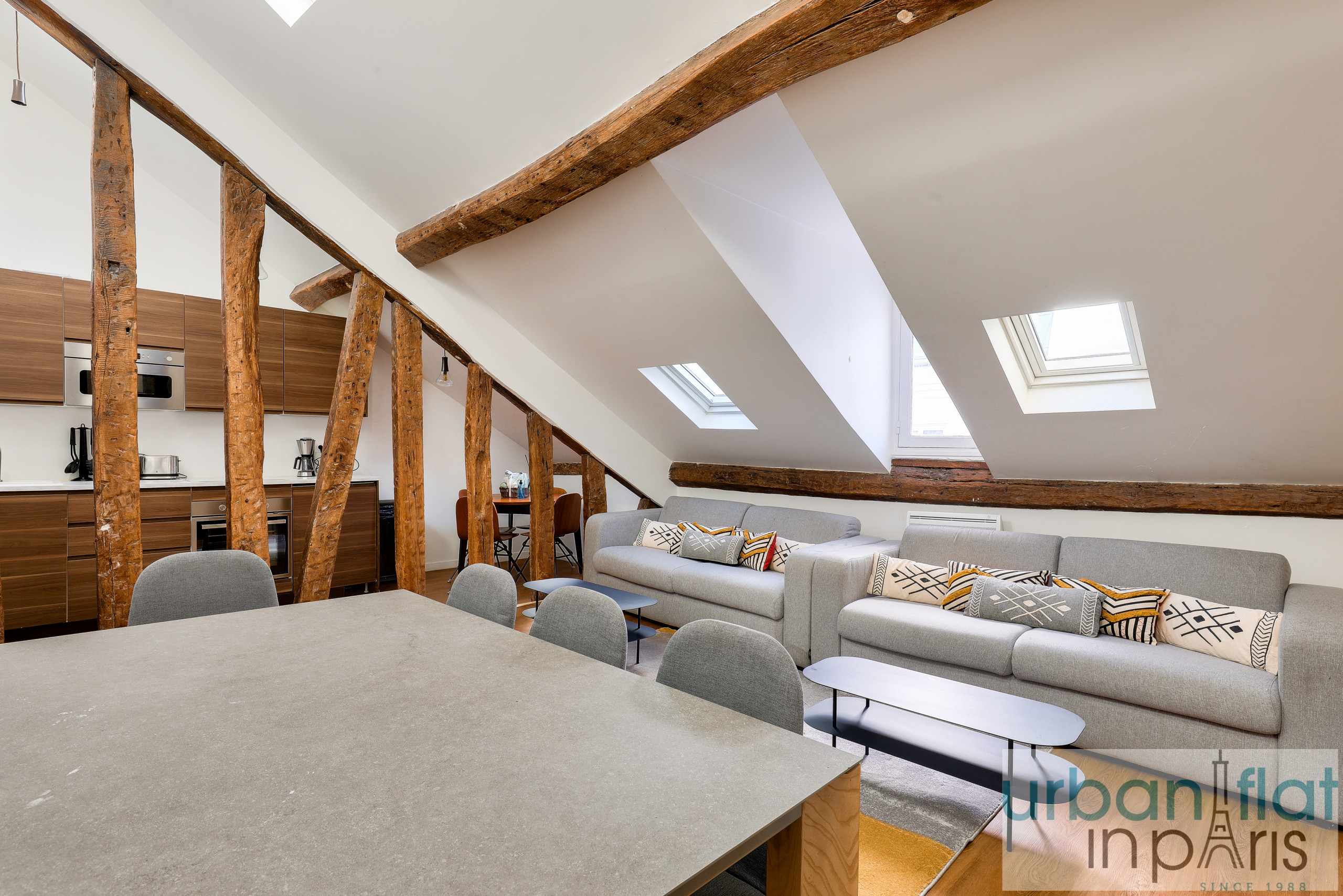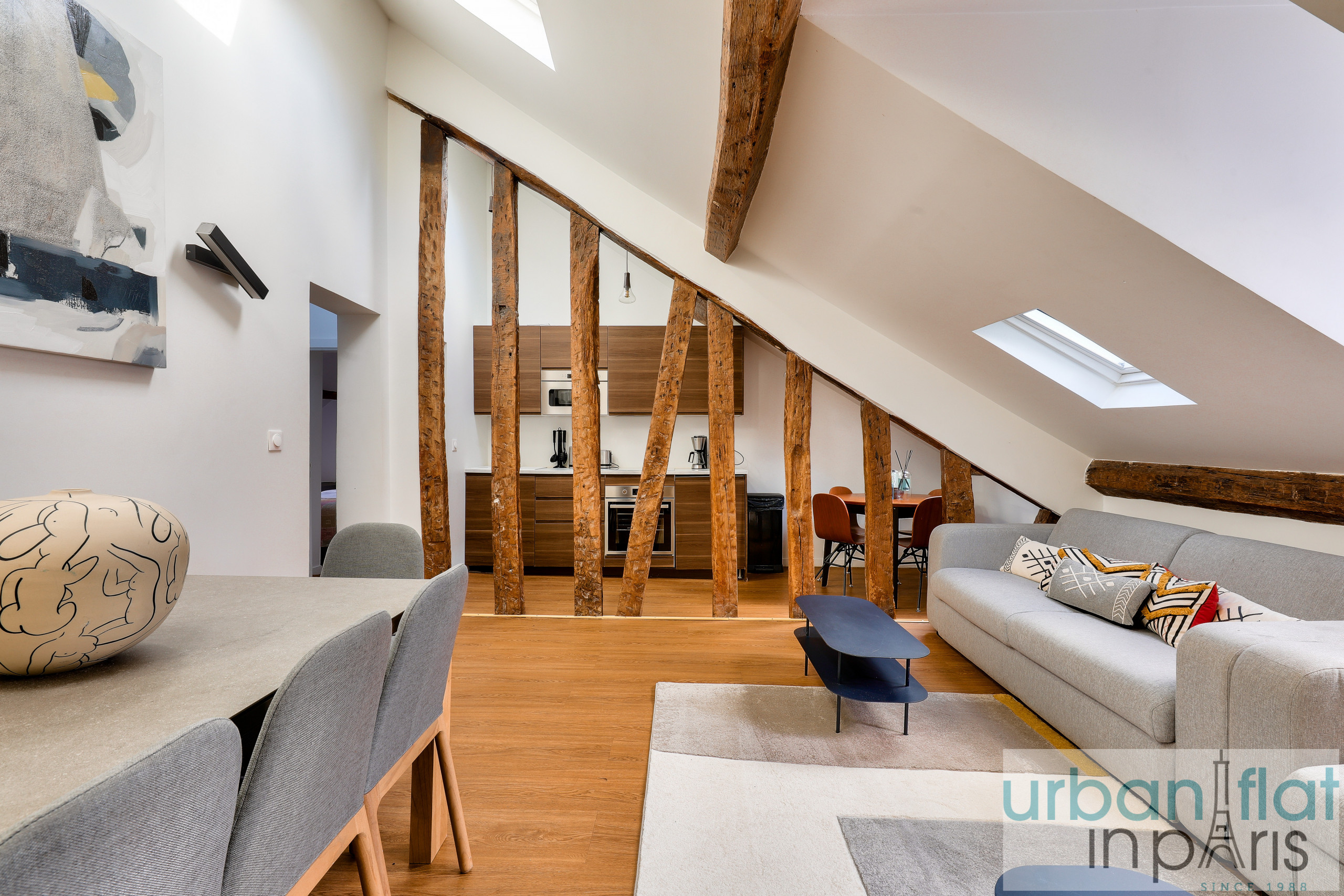 Our apartment will seduce you with its elegance and sobriety but also with the cosy and warm side that its exposed beams, so typically Parisian, give it.