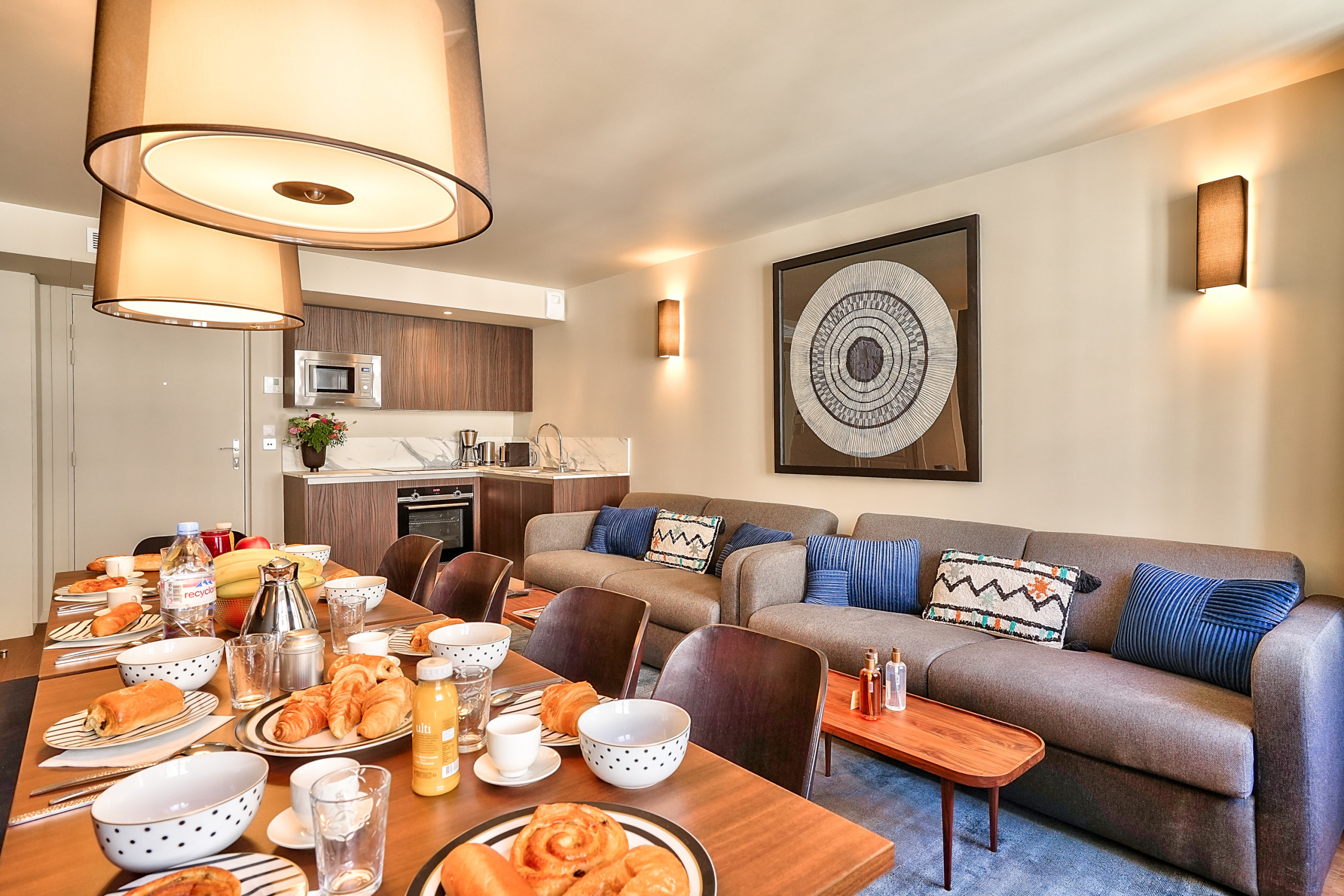 La cocina americana, está equipada con nevera, microondas, horno, lavavajillas, vajilla/cubertería, cafetera, tostadora y hervidor de agua.