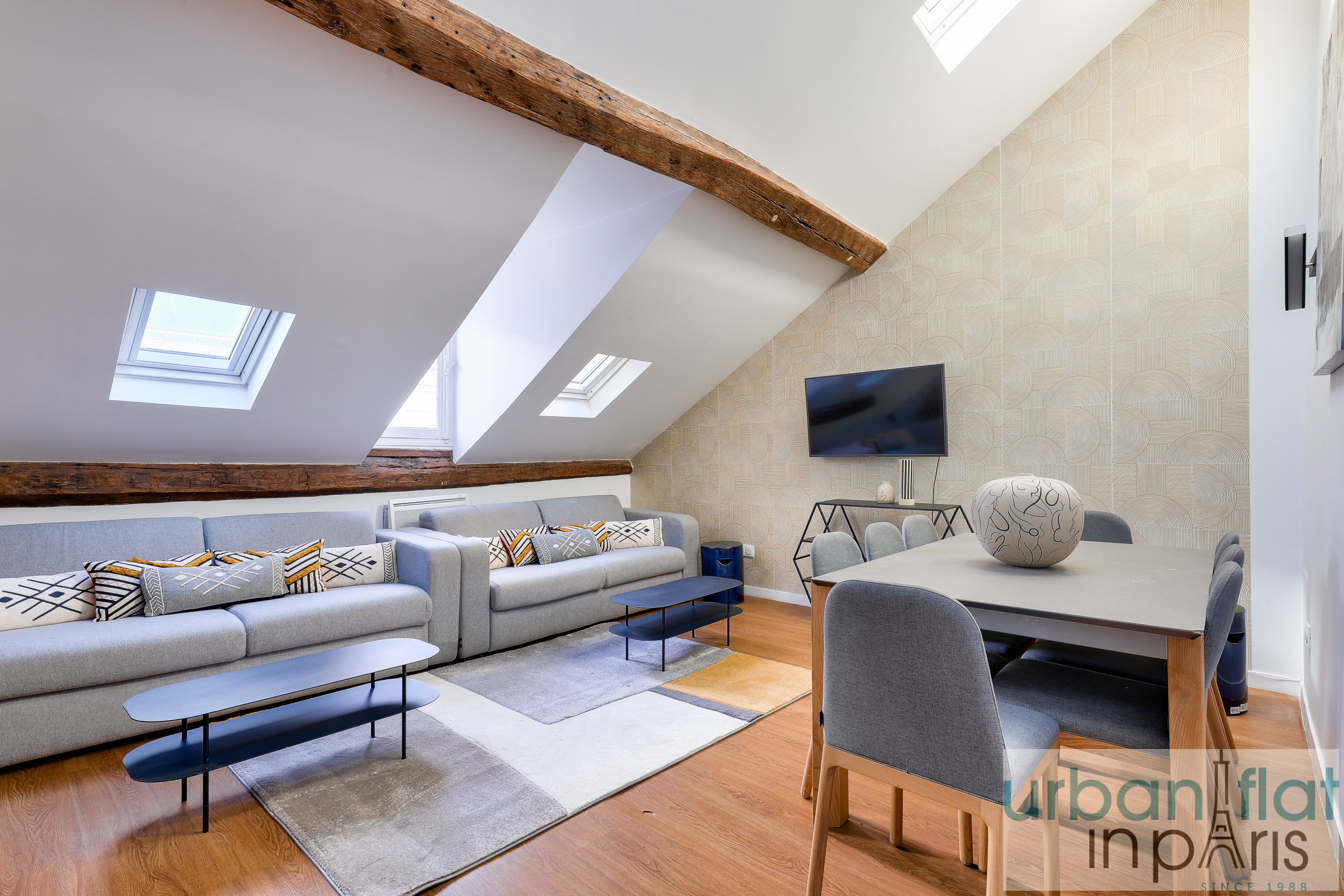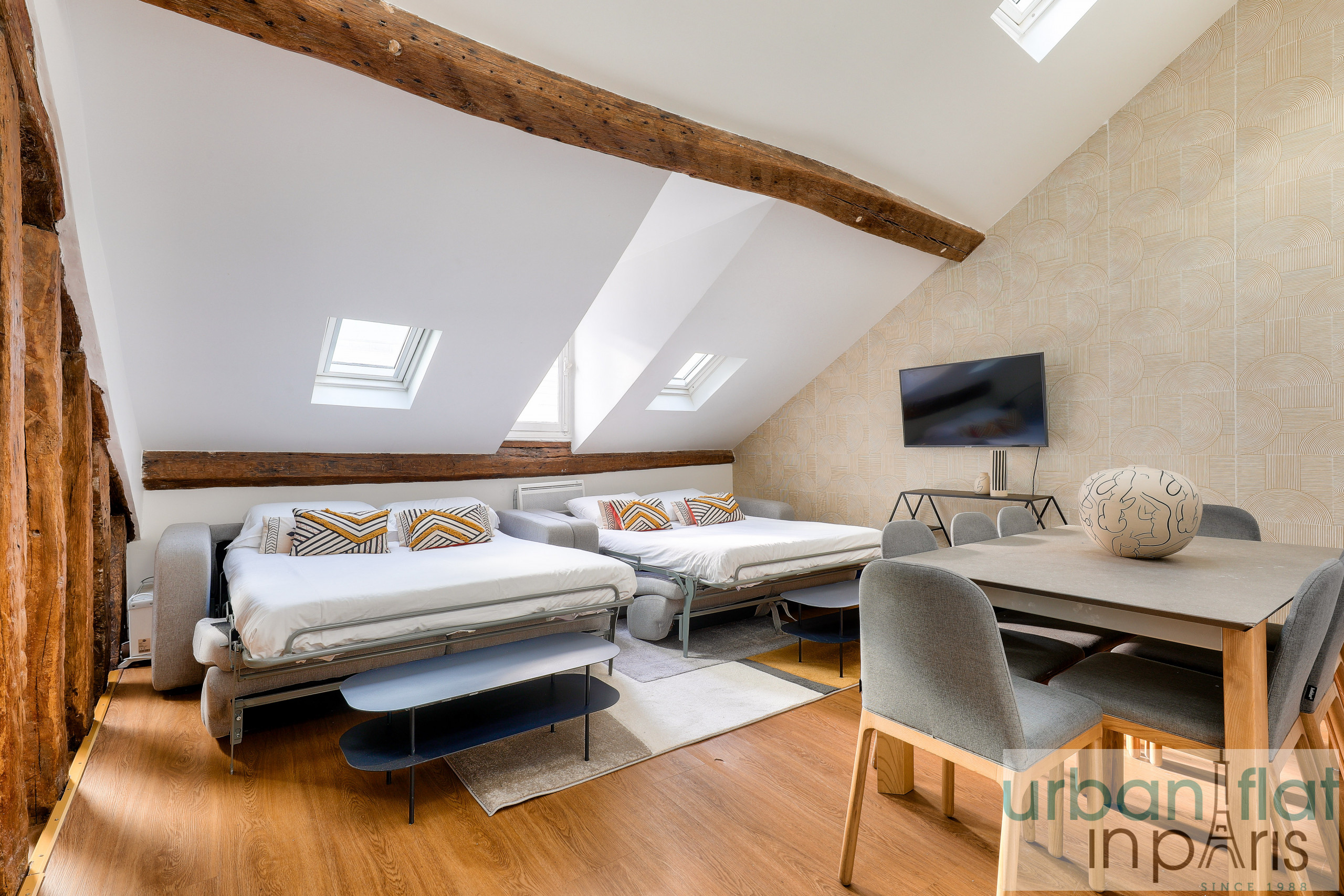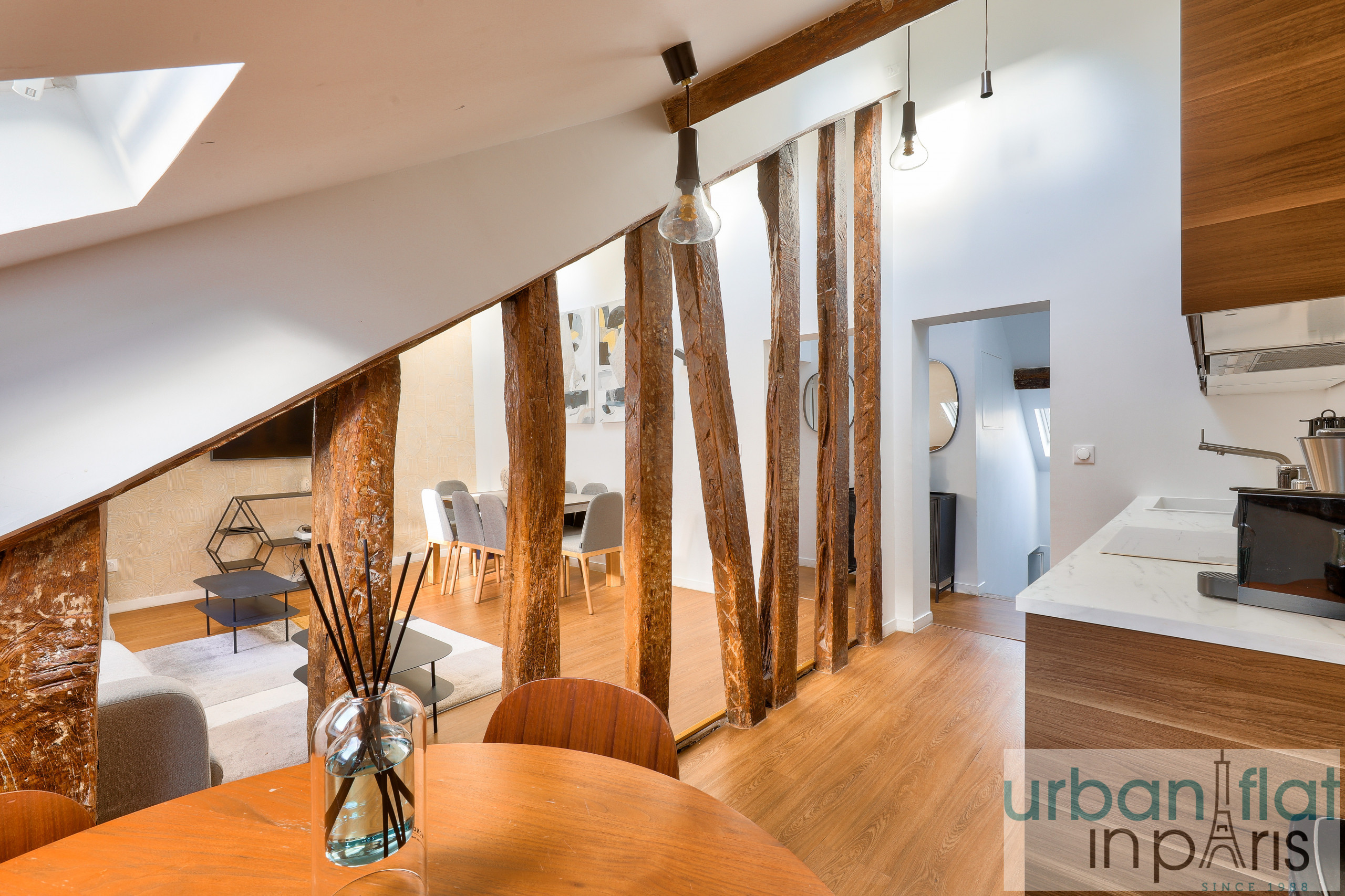 Nuestro apartamento le seducirá por su elegancia y sobriedad, pero también por el ambiente acogedor y cálido que le confieren sus vigas vistas, tan típicamente parisinas.