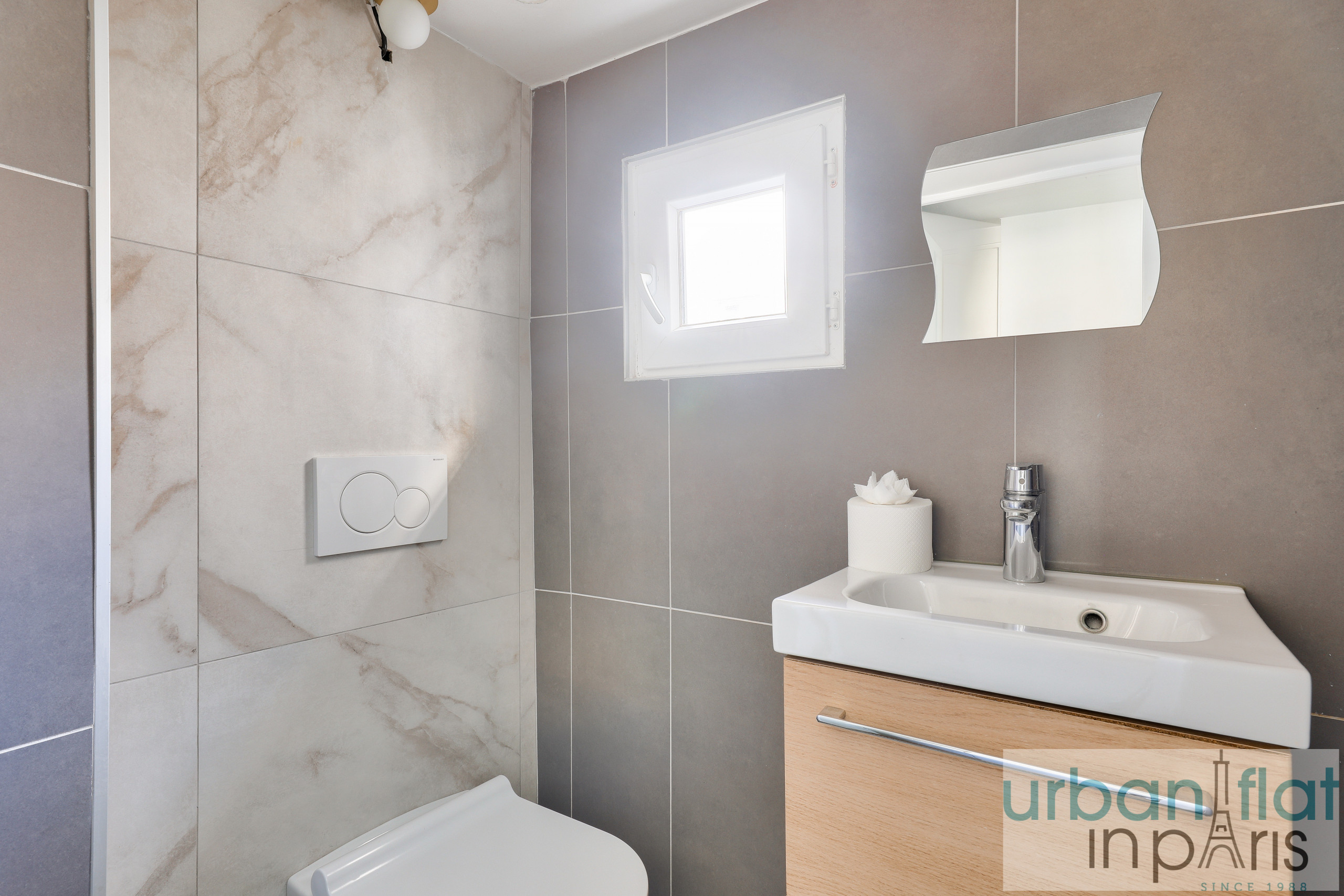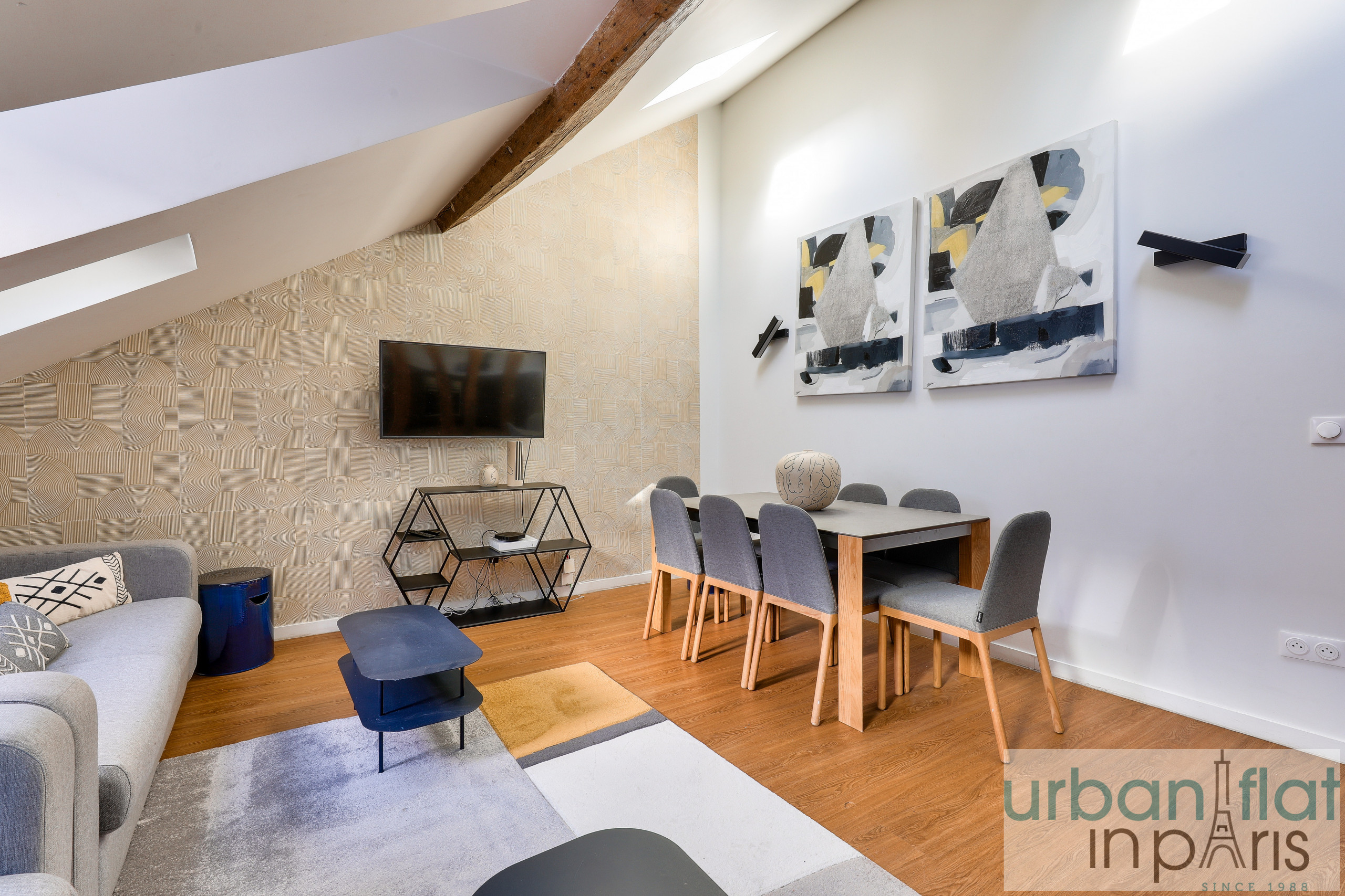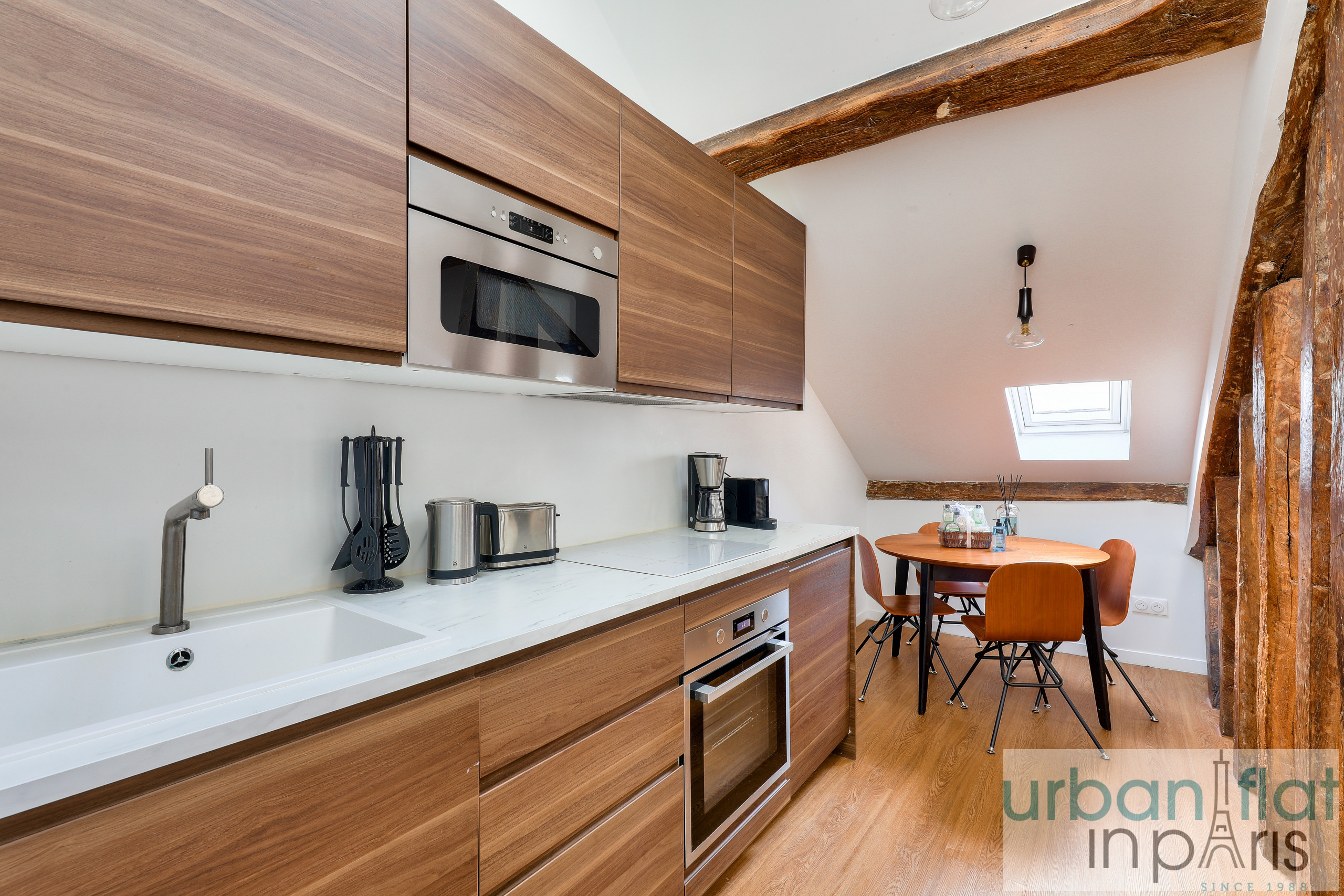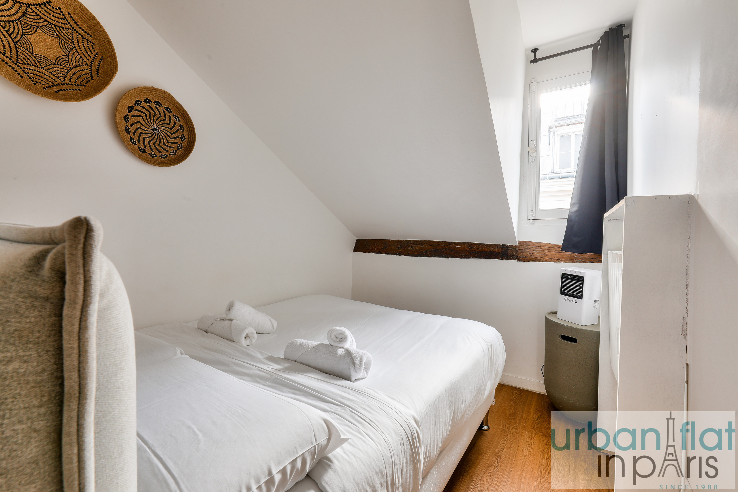 Nuestro apartamento le seducirá por su elegancia y sobriedad, pero también por el ambiente acogedor y cálido que le confieren sus vigas vistas, tan típicamente parisinas.