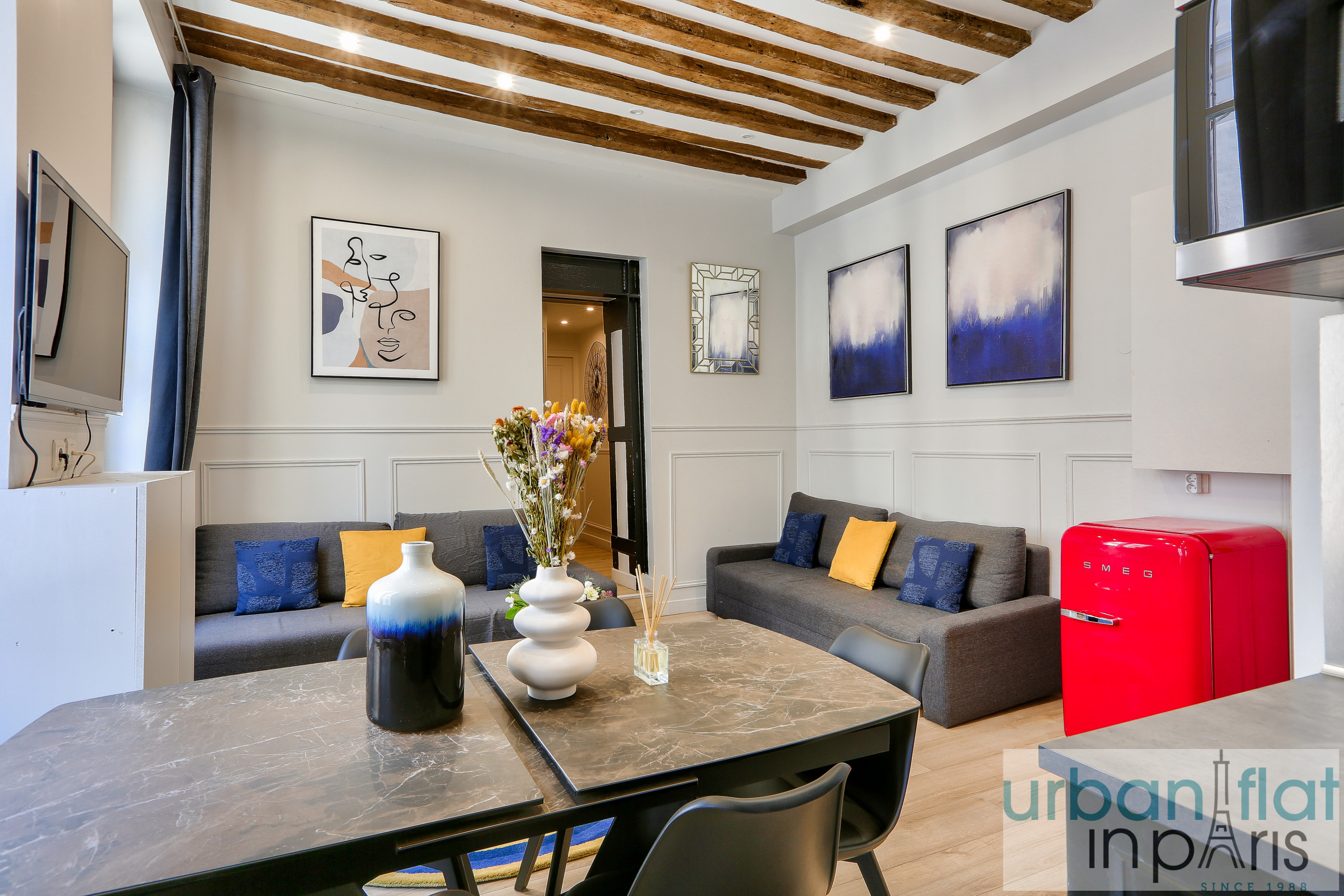 ¿Qué mejor que un gran salón luminoso para lograr estadías parisinas entre amigos? Pudiendo acoger hasta 9 personas, este gran apartamento está compuesto en efecto de una sala de estar abierta a dos grandes ventanas y una cocina americana de diseño, con el toque de encanto rústico de las vigas vistas y una elección cuidada de materiales. Si el refrigerador rojo retro se desmarca del conjunto, las dos habitaciones completan con elegancia este cuadro con ropa de cama de alta gama y tonalidades blanco topo.