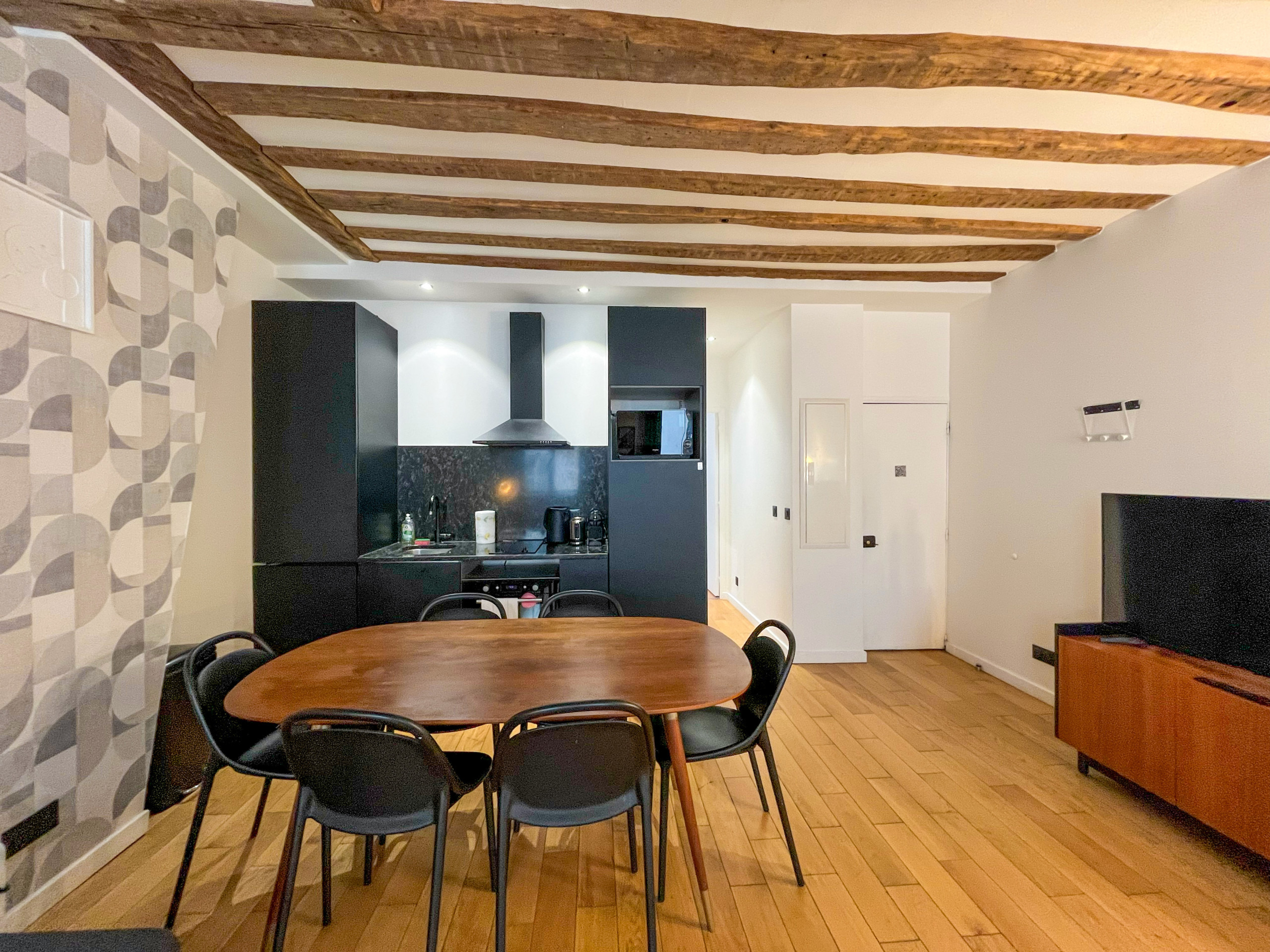 Después de un día muy ocupado en la capital, este espacio tranquilo será su refugio. Aunque modernizado, el apartamento conserva sus magníficas vigas vistas, añadiendo una atmósfera cálida y acogedora.