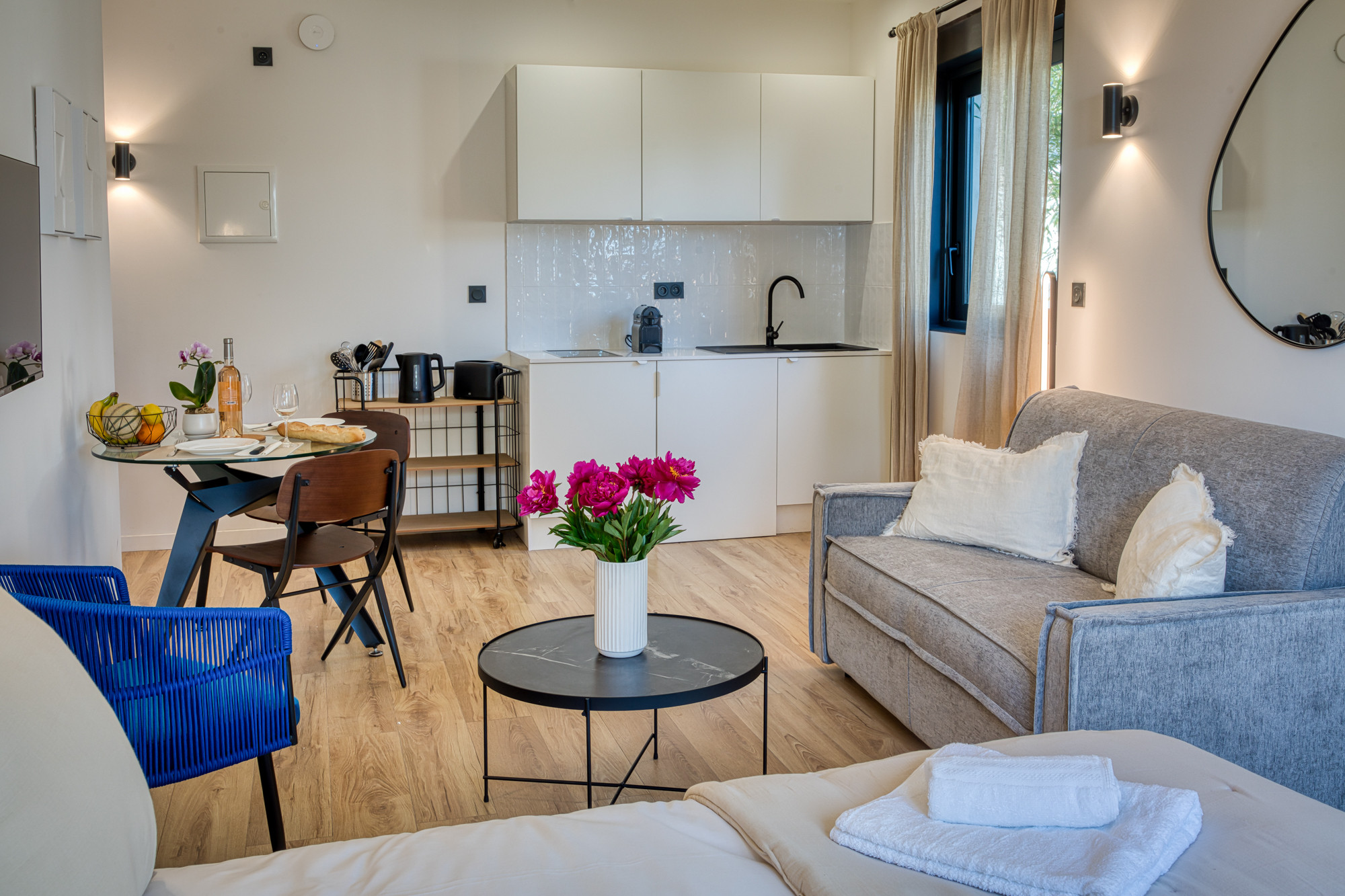 Cocina americana equipada (inducción, microondas, cafetera).