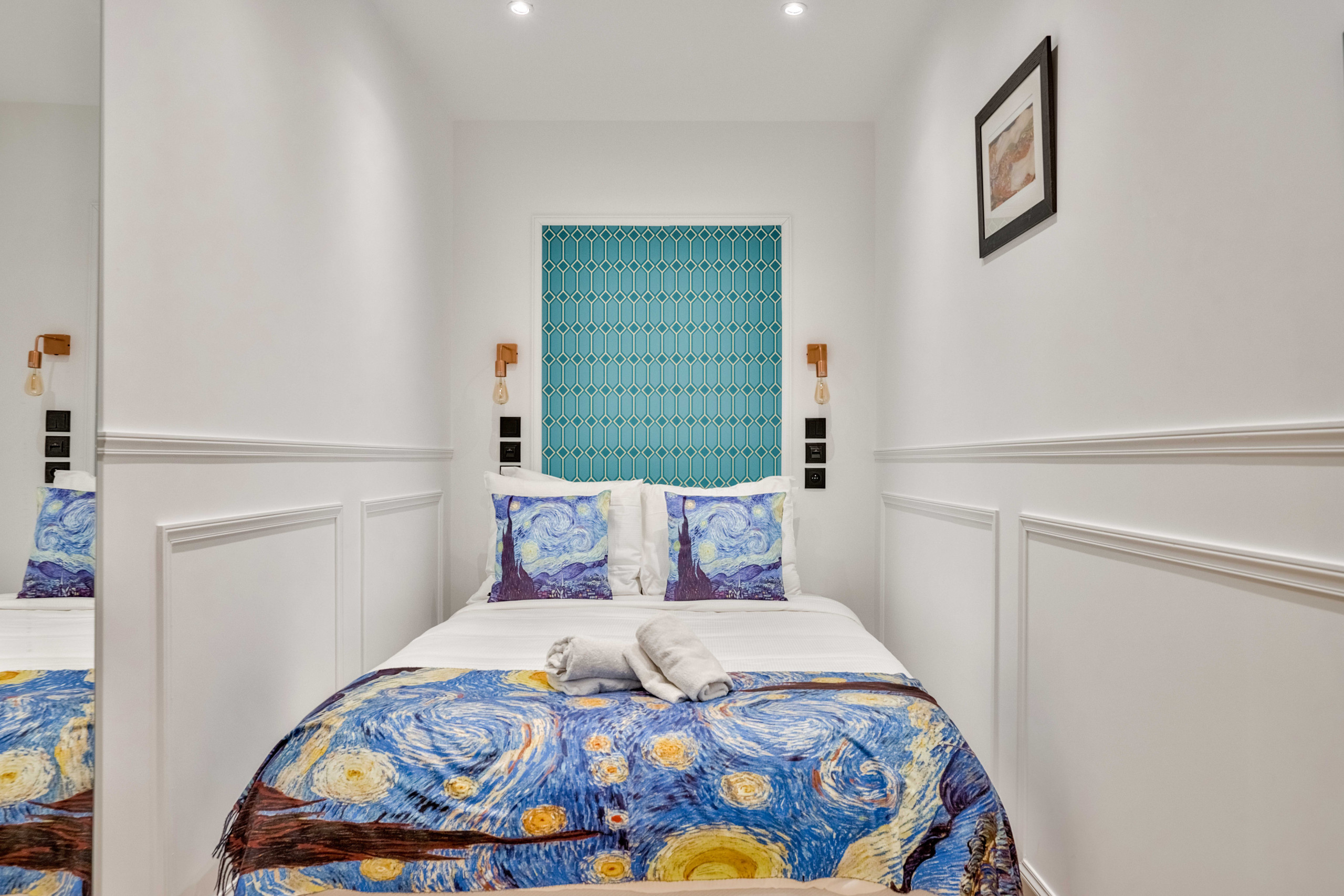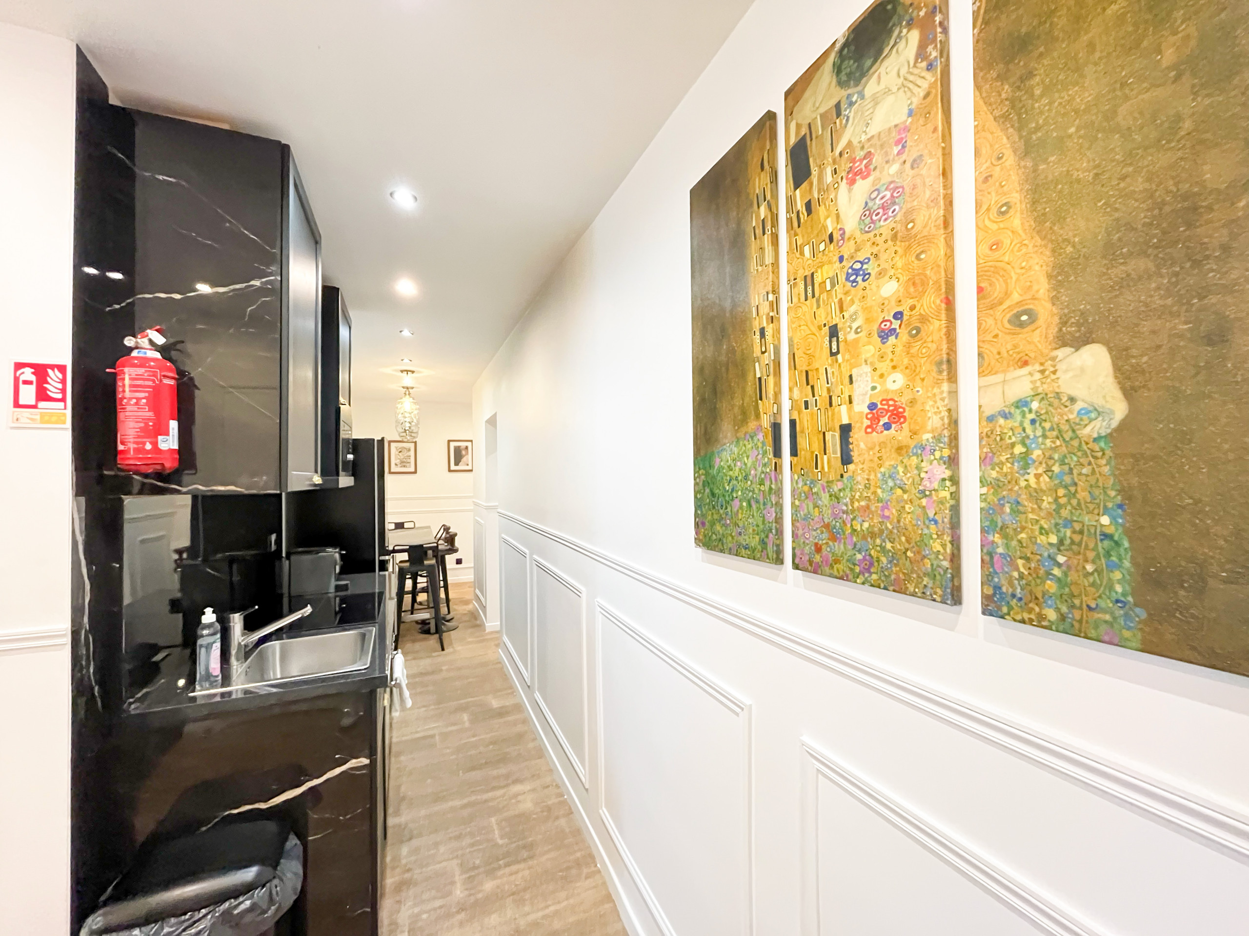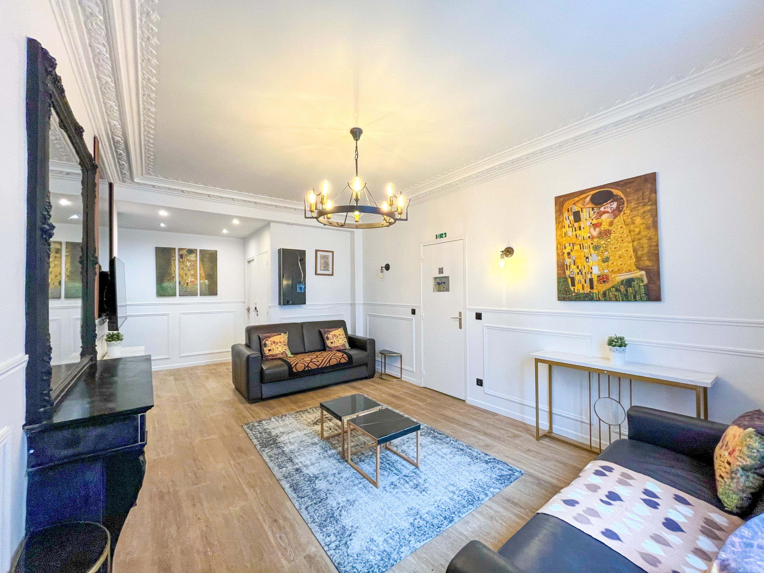 Immediatement apres avoir franchi la porte de notre appartement, vous serez immergé dans un autre monde. Celui du peintre Klimt. Vous retrouverez les oeuvres de l’artistes au salon et dans les chambres a coucher, ainsi que les tons chauds et mordorés qui lui sont chers …