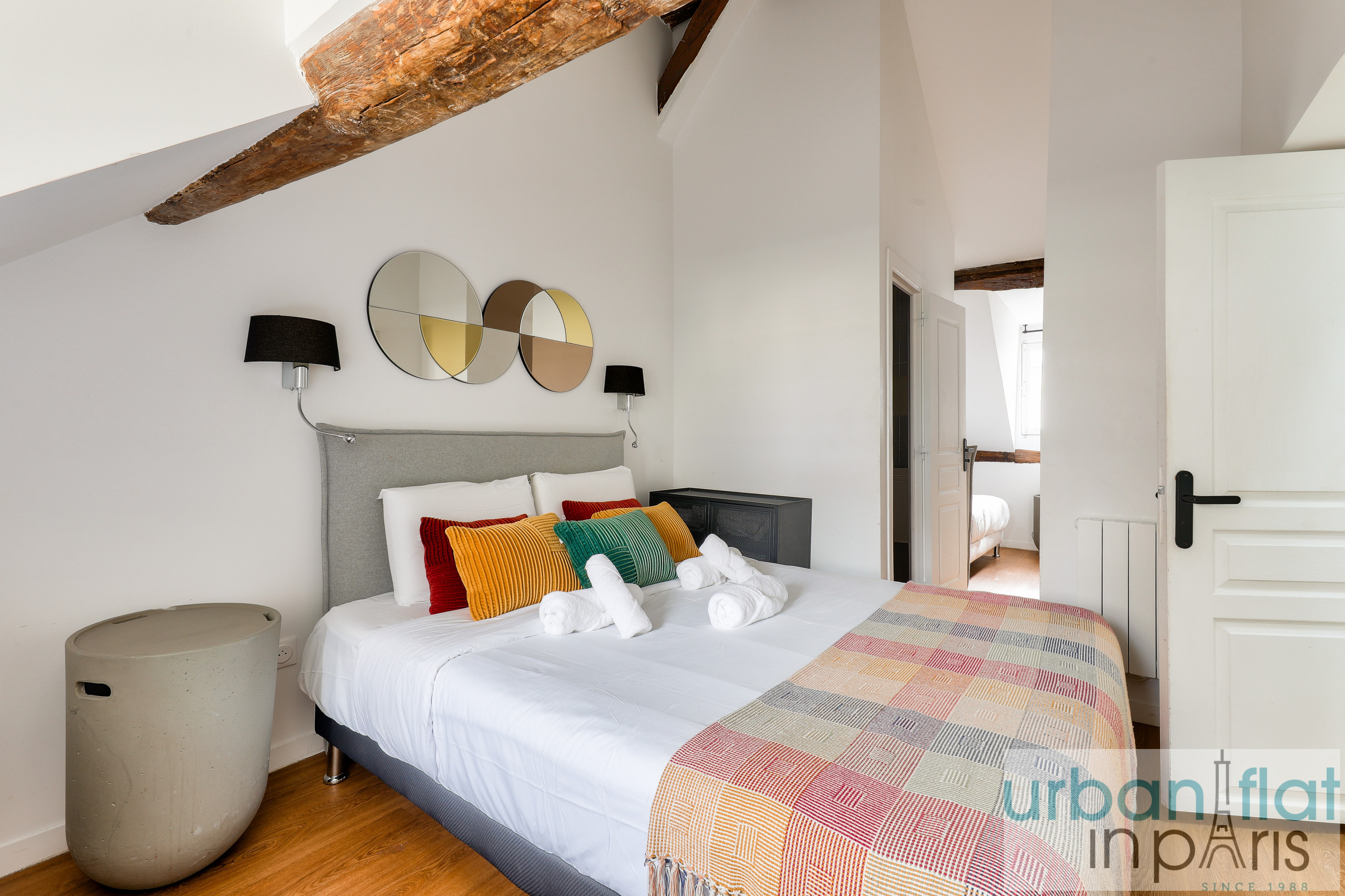 Notre appartement vous séduira par son élégance et sa sobriété mais également par le coté cosy et chaleureux que lui confèrent ses poutres apparentes, si typiquement parisiennes.