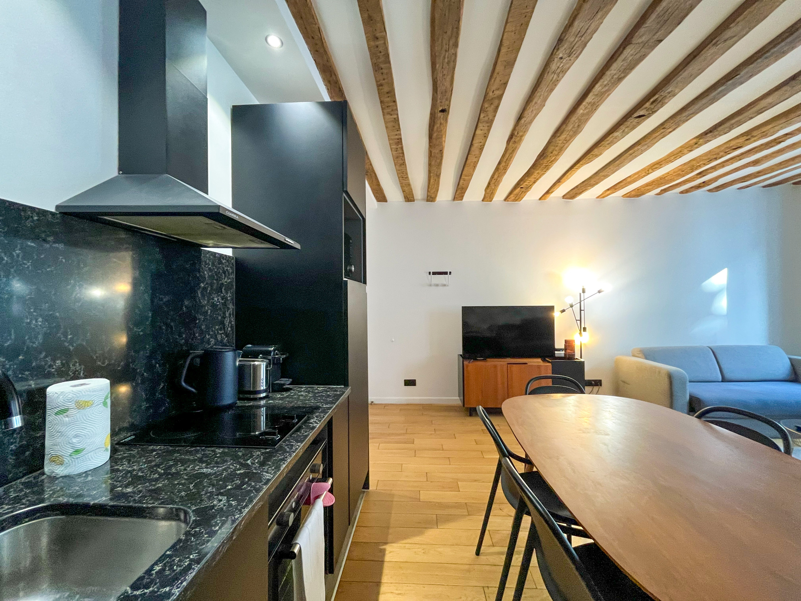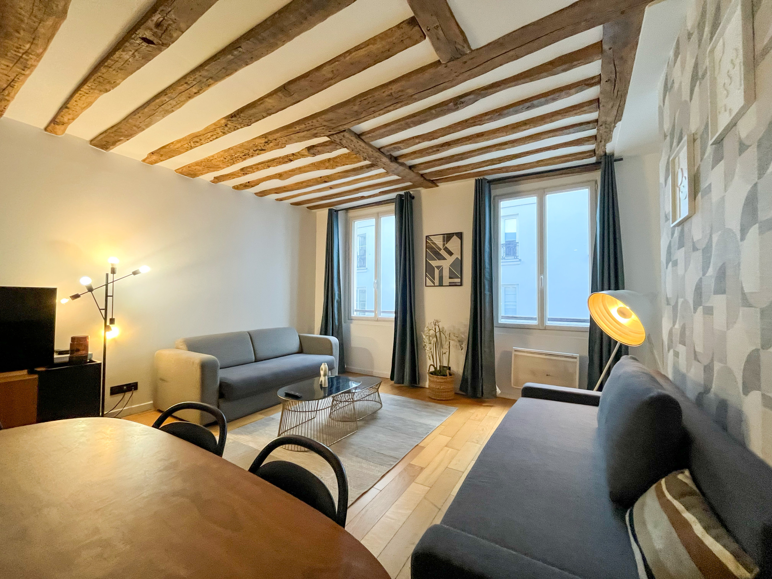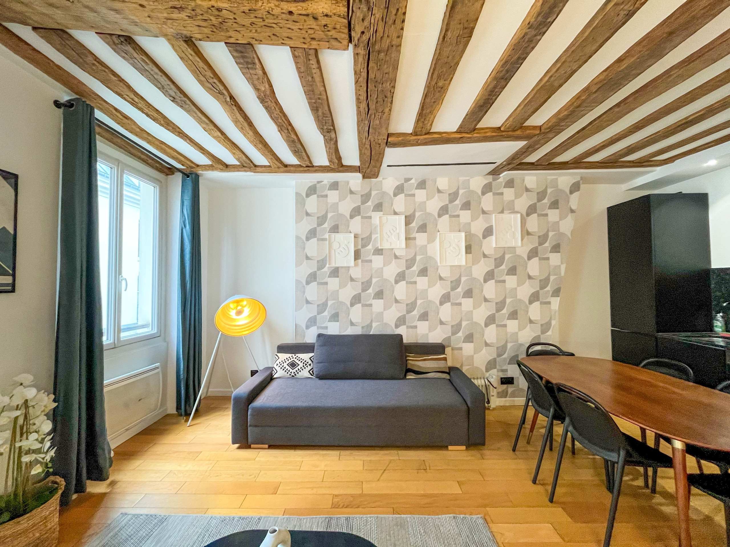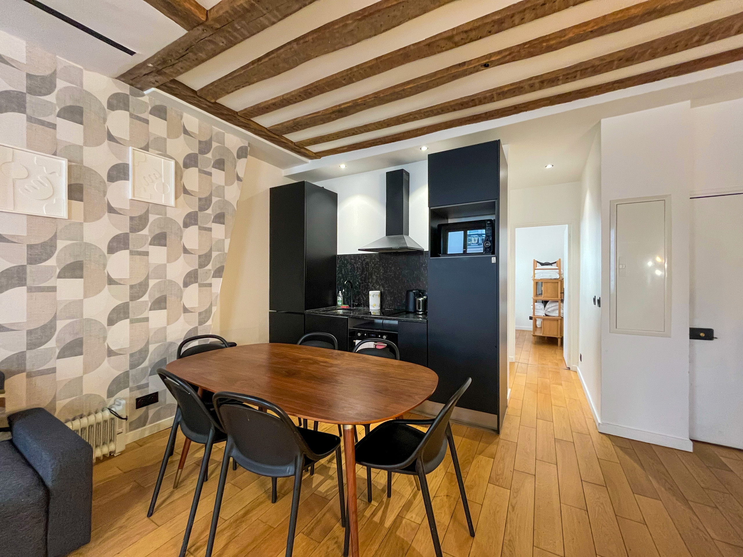 Après une journée bien remplie dans la capitale, cet espace tranquille sera votre refuge. Bien que modernisé, l'appartement conserve ses magnifiques poutres apparentes, ajoutant une atmosphère chaleureuse et accueillante.