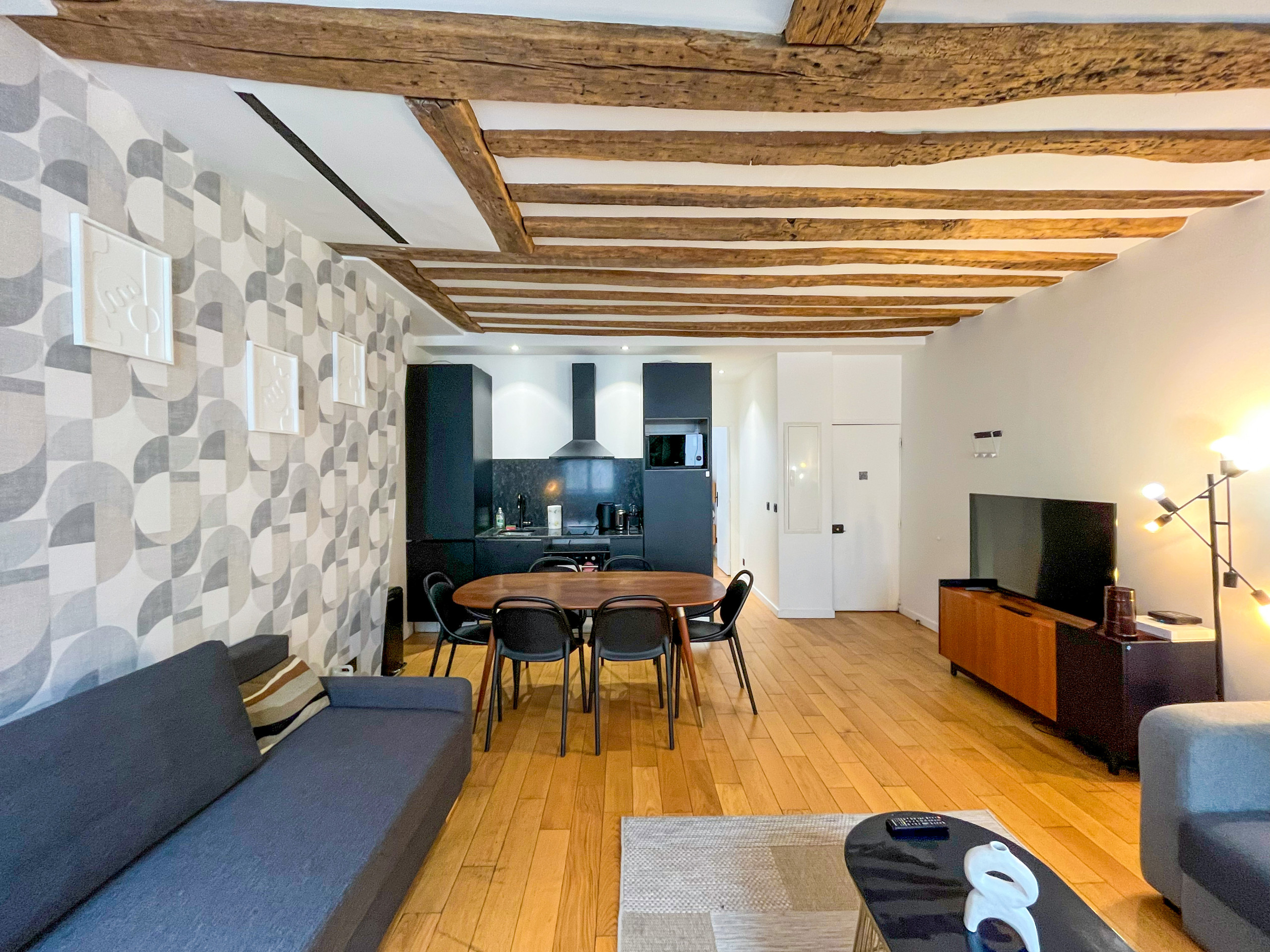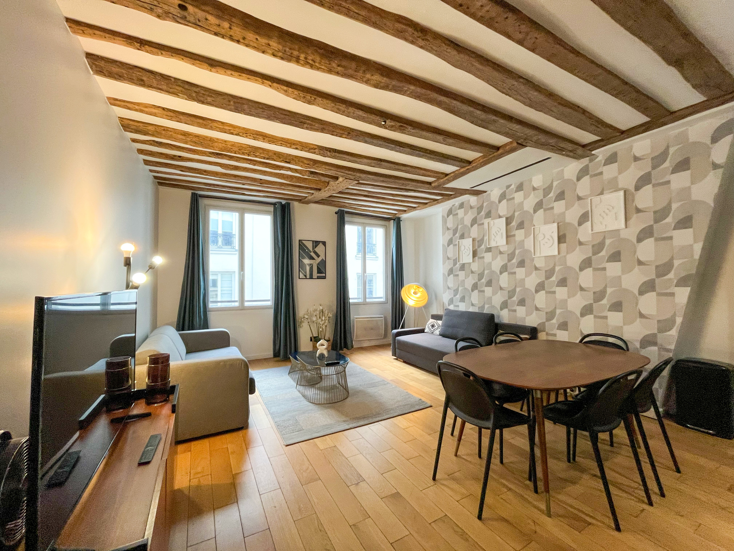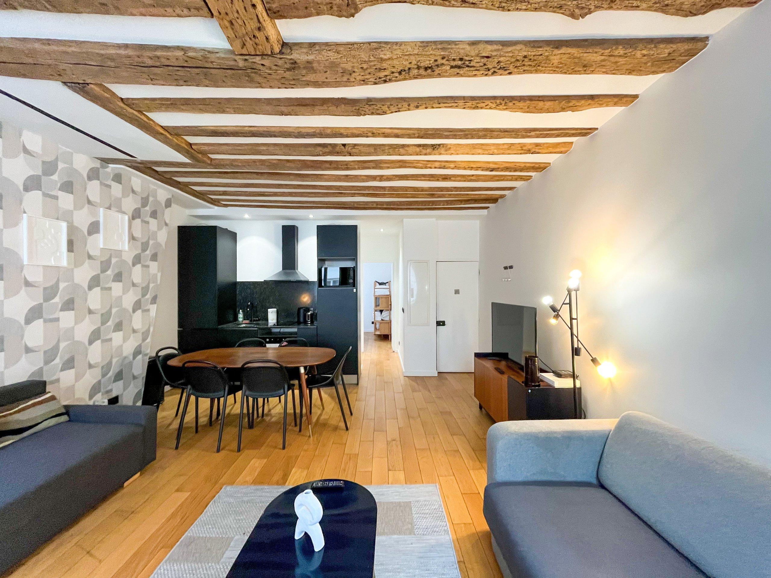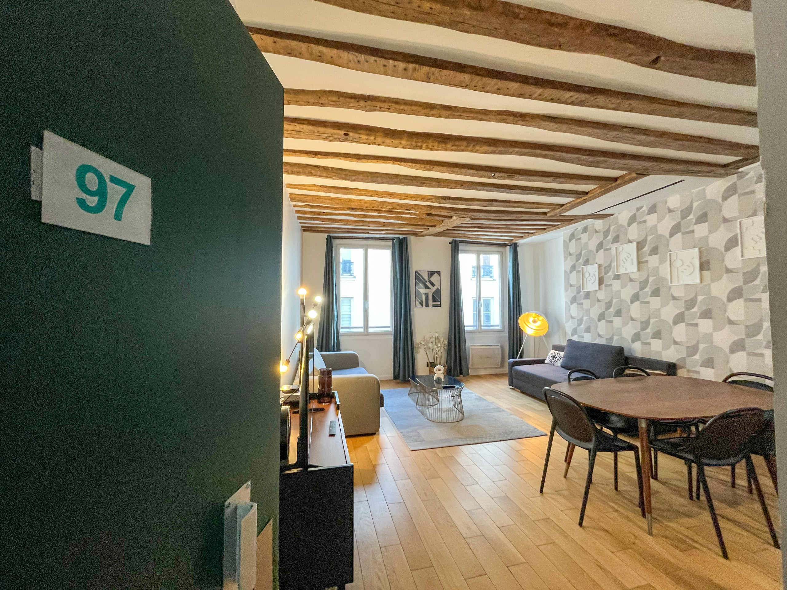 Après une journée bien remplie dans la capitale, cet espace tranquille sera votre refuge. Bien que modernisé, l'appartement conserve ses magnifiques poutres apparentes, ajoutant une atmosphère chaleureuse et accueillante.
