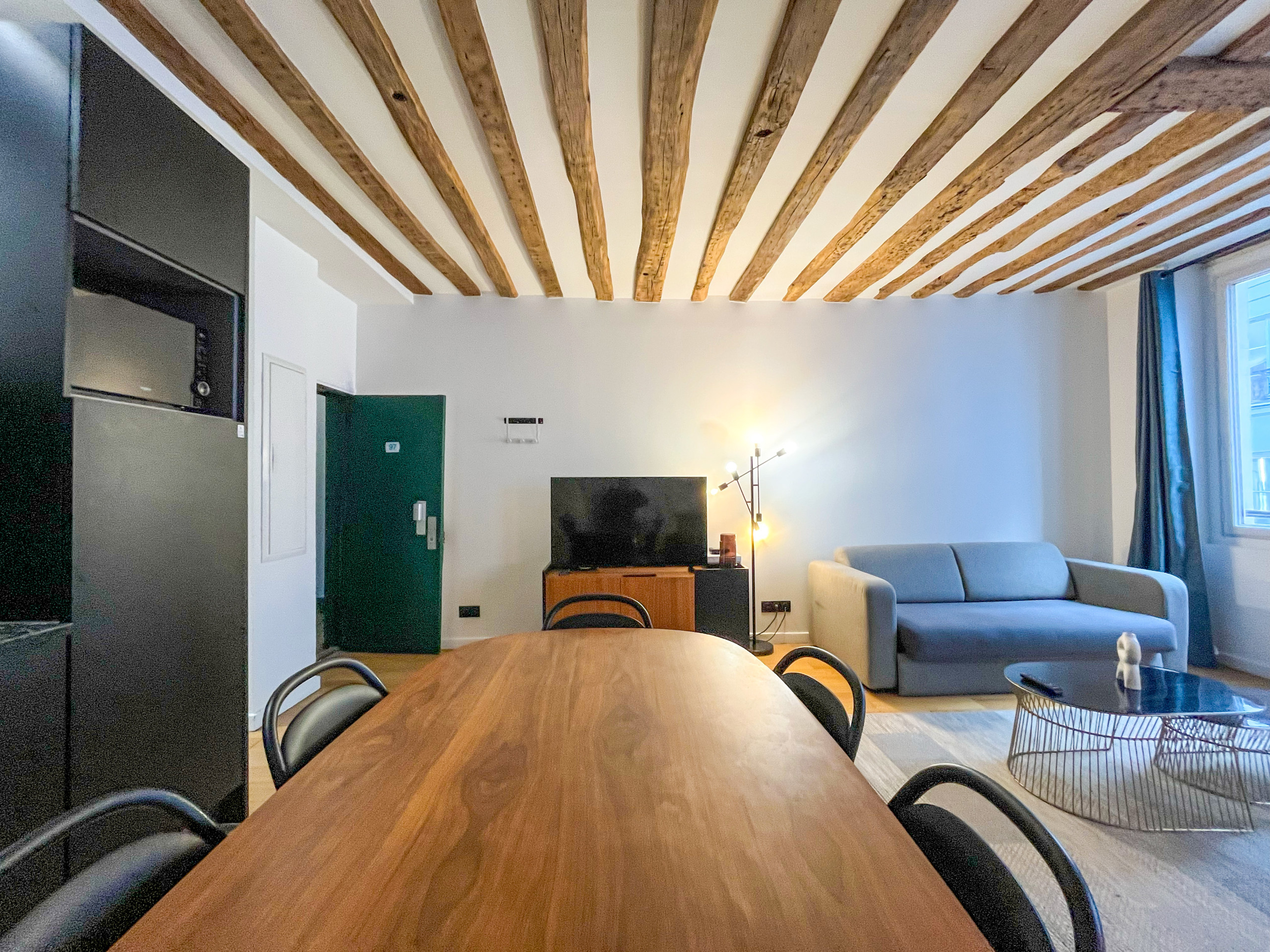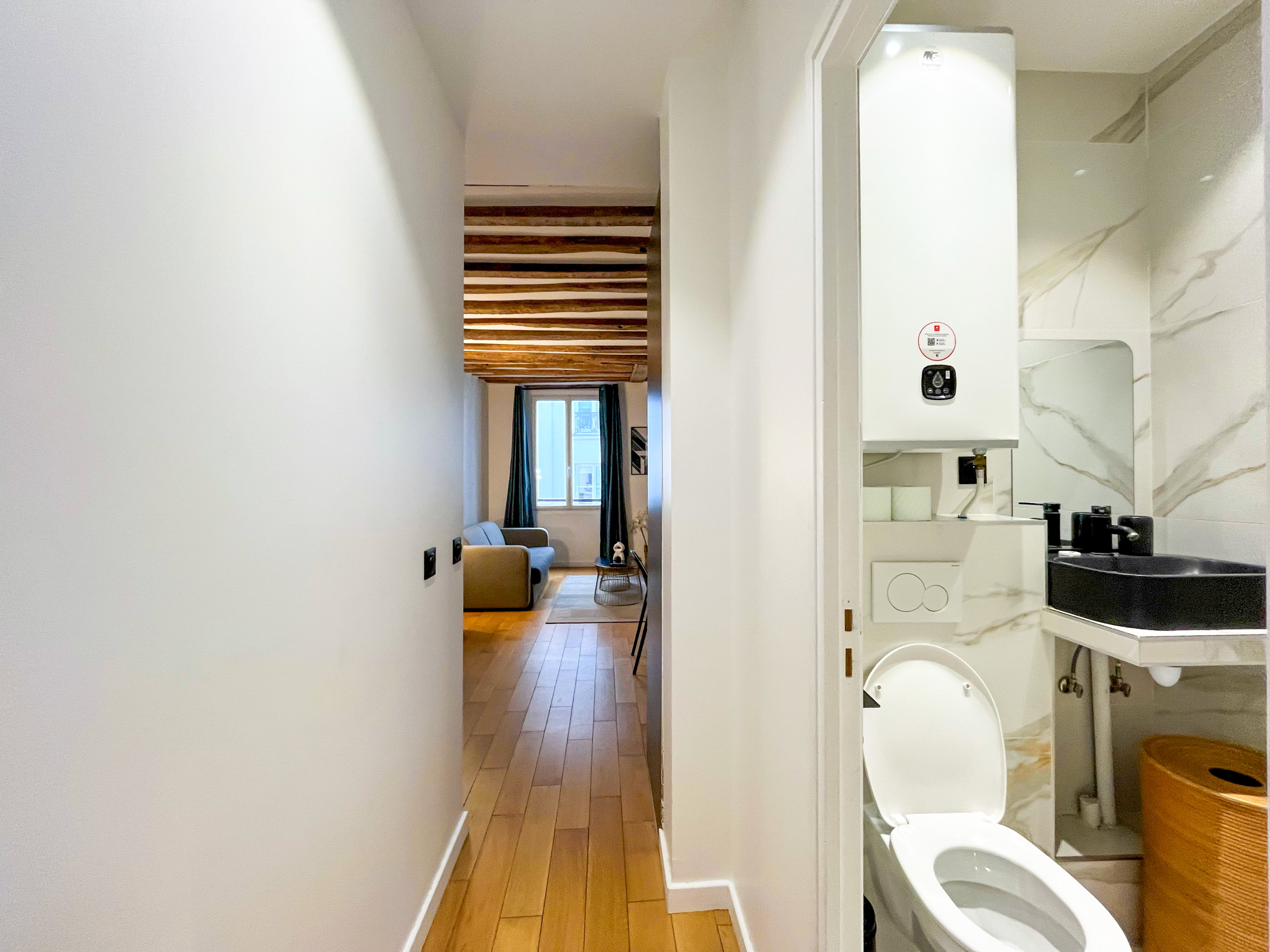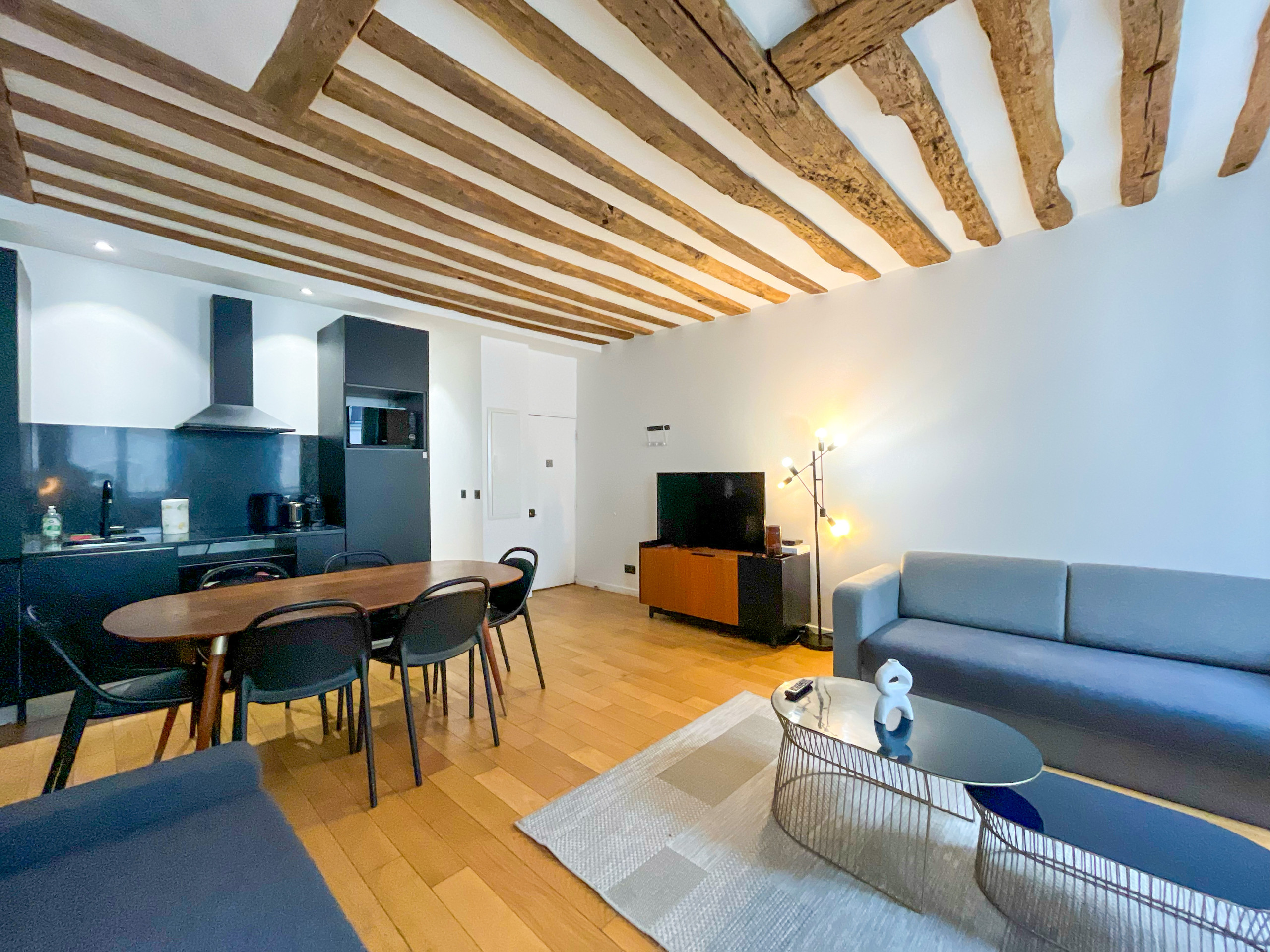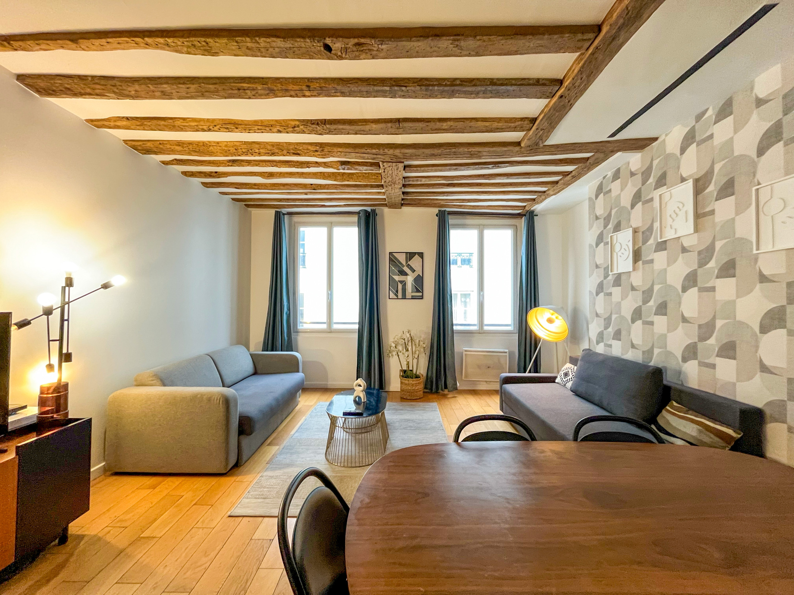 Après une journée bien remplie dans la capitale, cet espace tranquille sera votre refuge. Bien que modernisé, l'appartement conserve ses magnifiques poutres apparentes, ajoutant une atmosphère chaleureuse et accueillante.