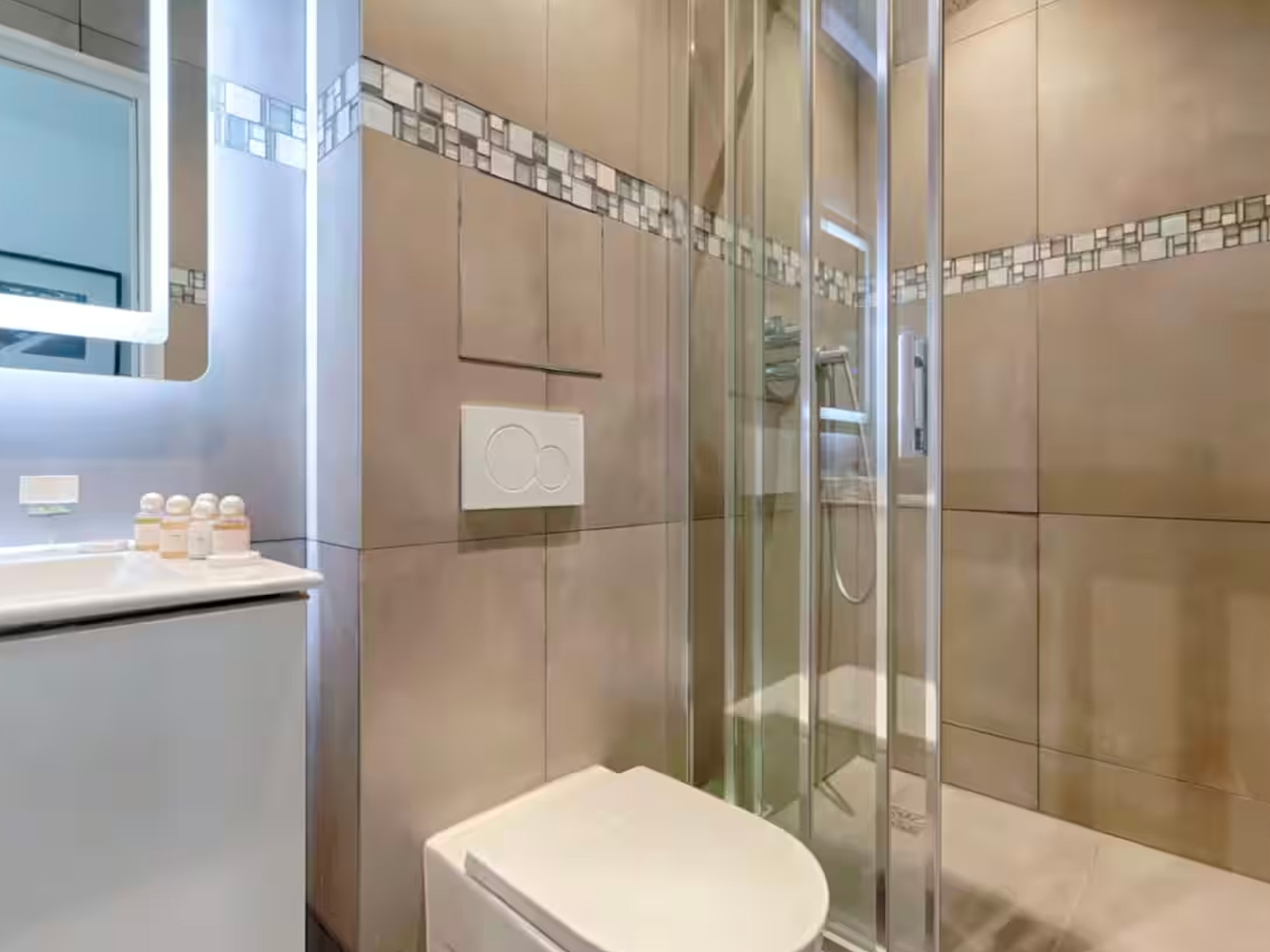 • Salle de Bain Moderne : Une grande douche fonctionnelle, des grandes serviettes douces, gel douche, shampoing, et un sèche-cheveux sont à votre disposition. Les toilettes sont intégrées pour un agencement simple et efficace.